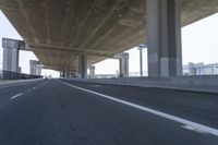 This stock photo showcases a car driving under a freeway bridge in a city area. The architecture of the concrete bridge is highlighted, with its strong pillars and beams. The road beneath the bridge is made of asphalt, providing a smooth surface for the vehicle. The image captures the daytime atmosphere, with natural light illuminating the scene. The motion blur effect emphasizes the movement of the car, adding a dynamic element to the composition. This photo is perfect for illustrating concepts related to infrastructure, road surfaces, highways, and urban transportation.
