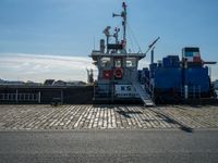 This stock photo showcases a cargo ship docked at Bremerhafen pier in the industrial city of Germany. The ship stands out against the clear blue sky and sunny weather. The urban design and road surface around the harbor provide a bustling city life backdrop. The image captures the essence of Germany's industrial and urban landscape.