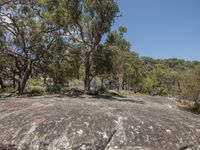 A rugged landscape of carved bedrock and large rocks, with trees standing strong. Open spaces and grass contrast with the hard shadows. Clear skies highlight the stunning forest scenery.