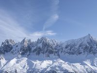 An awe-inspiring view of the majestic Mont Blanc in Chamonix, France. The snow-covered mountain range and glacial massif create a breathtaking landscape. Clear skies and contrails add to the charm of this popular tourist attraction in the heart of the Alps.