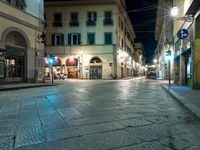 a narrow street with buildings lit up at night in europe, with cobblestones