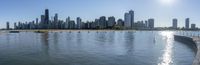A stunning view of Chicago's city skyline across the water from a park on a sunny day. The modern architecture and skyscrapers reflect in the clear water of Lake Michigan. The sun shines brightly in the center of the picturesque cityscape.