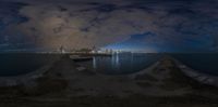 A stunning view of Chicago's skyline at night, captured from a long pier near the coast. The city's modern architecture is illuminated by artificial lights, reflecting beautifully in the calm waters. A clear sky reveals the moon and stars, adding to the magical atmosphere.