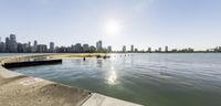 A sunny day in Chicago, Illinois with a clear sky. The city's impressive skyline contrasts with the calm water of the lake. Modern architecture and open spaces add to the urban charm.