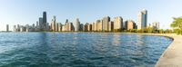 The iconic city skyline of Chicago, Illinois seen from Lake Michigan on a clear summer day. Modern architecture and skyscrapers dominate the metropolitan area, contrasting with the coastal open space and gentle waters. A perfect spot for recreational activities.