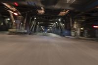 A night scene in Chicago, Illinois. Blurry image captures the motion of a train approaching the platform below a bridge. City lights streak through the urban thoroughfare, showcasing the city's vibrant architecture and urban design.