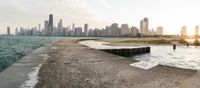 This image captures the bustling city of Chicago, Illinois in the USA. The cityscape showcases the iconic skyline with towering skyscrapers against the backdrop of a clear day. People can be seen walking along the water, creating a lively atmosphere in this urban metropolitan area. The view overlooks the river, which adds to the charm of this vibrant city. This photo represents the energetic and dynamic spirit of Chicago.