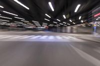 A night view of a concrete street in Chicago, Illinois. The city's architecture is illuminated by street lights, creating light streaks and a sense of motion. The urban design features straight roads and a parking lot.