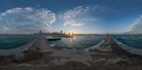 Panoramic view from an outdoor jetty in Chicago, USA, with the city skyline in the distance. The coastal shore is bathed in sunlight, reflecting off the calm waters of Lake Michigan. A perfect sunny dawn in the city by the lake.
