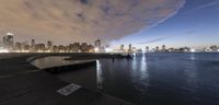 Nighttime cityscape of Chicago, Illinois. The city's skyline reflects on the water, creating a stunning urban reflection. Boats glide through the picturesque metropolitan area under a cloudy sky.