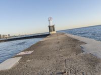 A straight road lined with low-rise buildings leads to the coastal waters of Chicago, Illinois. The beach walkway offers a perfect view of the ocean, with a bridge and pier in the distance. A concrete street runs parallel to the shore.