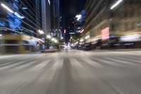 cars driving along an empty city street at night with the city light on and one is blurred