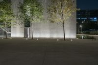 three trees are lit up on a sidewalk near the concrete wall of a building at night