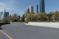 A white car drives down a city street in Guangzhou, China. The clear sky highlights the tall buildings in this urban scene. A typical day in the bustling city of Guangdong.