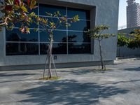 three trees outside an office building with city views reflected in the window windows and red fire hydrant