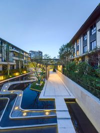 a building with large courtyard area at night next to a pool and trees around it