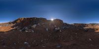 A rugged mountain landscape in Yunnan, China. The sun shines brightly, casting a lens flare on the top of the mountain. Rocks and debris create a Mars-like foreground. A natural environment in Shangri-La.