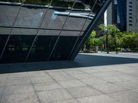 A modern city plaza in Taipei City, Taiwan, with a bustling urban atmosphere. Skyscrapers tower over the open space, while a bus and pedestrians navigate the asphalt road. Futuristic architecture, glass walls, and hard shadows add to the city's dynamic energy.