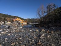 a small river flowing in to a wooden house on the top of a hill with buildings nearby