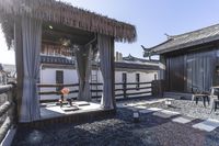 A classic Chinese villa with traditional architecture in Lijiang, Yunnan. The villa is surrounded by an urban garden and open spaces. Clear skies give a perfect backdrop to the traditional courtyard and gravel surface.