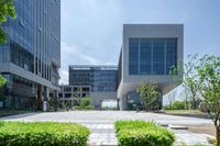 A serene walkway connecting two office buildings in the business district of Chongqing, China. The open space and greenery create a peaceful suburban oasis in the bustling urban cityscape.