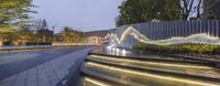 In the city of Chongqing, China, a stunning architectural marvel. The waterfront complex features illuminated stairs, fountains, and trees. Enjoy a tranquil walk in the suburban courtyard under the clear evening sky.