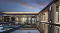 A residential building in Chongqing, China surrounded by open spaces and overlooking a lake. The building's architecture blends suburban and modern designs. An artificial light illuminates the plaza and swimming pool at dusk.