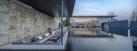 A residential villa in Chongqing, China, with an open space courtyard facing the water. The hotel's concrete walls create a reflection of the clear sky and boats docked below. A peaceful dawn in Asia.