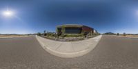A unique circular building stands out in the desert landscape of Los Angeles, California. Modern architecture blends with the clear sky, while the sun casts a vibrant yellow hue. This low-rise residential property embodies the city's urban design and vibrant city life.