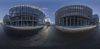 two circular buildings near one another with a sidewalk running between them in the middle of them