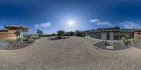 A circular house with a wood roof and angled walkway surrounded by cactus plants. The modern architecture blends with the natural environment, creating a unique residential area. Clear skies and sunshine illuminate the scene.