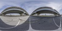 A sunny day in the city with a clear blue sky. The fish-eye lens captures the symmetrical architecture of the concrete bridges and underpasses. The straight roads and rolling asphalt lead to residential areas and open spaces.