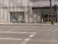 This is an image of a classic architecture building in Los Angeles, California, USA. The building has a beautiful facade and is situated in a metropolitan area. The road surface, made of asphalt, stretches in front of the building with traffic lights and curbs along the sidewalk. It showcases the urban design of the city. The grey storefronts of the shops add to the urban vibe of the area. This image captures a sunny day in Los Angeles, showcasing the architecture and urban landscape.