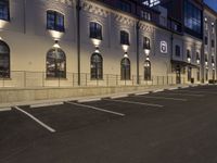 there is a parking lot outside the building at night time is empty, and empty but no people can use it