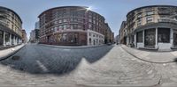 A black-and-white photo of the city center with buildings shot using different panoramic lenses. Symmetrical facades and urban design create a visually stunning scene. Dawn illuminates the alley-ways and thoroughfares.