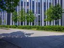 A unique perspective of a city intersection captured through a fisheye lens. The modern architecture and open space create a vibrant urban design. Clear skies and hard shadows enhance the city's energy and atmosphere.
