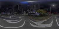 a 360 - angle lens shows traffic passing through a city intersection and buildings as well as dark clouds