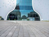 This is an image of the entrance to an office building in Taichung, Taiwan. The modern architecture features polka dot walls and a concrete walkway, reflecting the urban design of the city. The open space in front of the building provides a surface for pavers. This photo represents the vibrant city life and architectural landscape of Taichung.