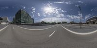 A view of Barcelona's bustling business district, with modern office buildings lining the straight, asphalt road. The city's urban design showcases a blend of European architecture and modern profiles. Hard shadows add a dramatic touch to the vibrant city life.