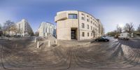 A unique perspective on a street in Berlin, Germany, with an upside-down camera effect in the foreground. Modern architecture lines the road, creating a vibrant cityscape. The yellow facade of a building adds a pop of color to the urban design.