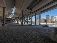 Berlin's urban landscape, marked by modern architecture and cobblestone streets. Clear skies cast hard shadows over bridges and underpasses, highlighting the city's unique European charm and design aesthetic.