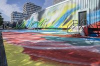 This image captures the vibrant city life of Berlin, Germany. The modern architecture of the downtown area contrasts with the colorful graffiti and murals that adorn the buildings. The clear sky allows for a great view of the city's metropolitan area. In the courtyard of a warehouse-turned-gallery, visitors can admire the visual arts showcased in the art district. The multicolored graffiti wall showcases the creativity and urban design that is characteristic of Berlin. This photo represents the dynamic and artistic spirit of the city.