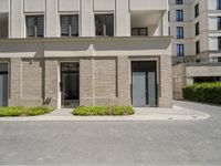 A modern residential building in Berlin, Germany. The grey facade and rectangular windows give it a sleek and urban look. The cobblestone road surface adds charm to the surrounding urban design. A perfect example of city life in Europe.