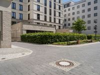 a street with multiple bushes surrounding an area for parking in a city area with cobblestone floors