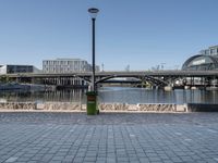This stock photo depicts a walkway on the banks of the river in Berlin. In the background, a tall city with modern architecture can be seen, along with a bridge. The image showcases the vibrant city life and urban design of Berlin, with clear skies overhead, creating a picturesque scene. The cobblestone road and jetty add to the charm of this European city in Germany.