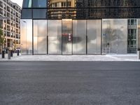 A modern architecture building in Berlin, Germany. The facade features rectangular windows and a symmetrical design. The sleek metal walls reflect the vibrant city life. Located in the heart of the business district, this futuristic office building is a symbol of urban design and European business.
