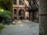 This image showcases the architecture of Berlin, Germany. It features a modern residential building with a brick facade and floor-to-ceiling windows. The building is surrounded by open green spaces with well-maintained grass, vegetation, and cobblestone curbs. The photograph captures the vibrant city life and urban design of Berlin. In the background, there is a city street with classic architecture buildings, including a warehouse and an office building. This photo represents the city's bustling business and financial district. It portrays the unique blend of classic and modern architecture that defines Berlin's urban landscape.