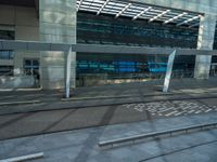 A modern office building in the heart of the bustling city of Holland, Netherlands. The walkway on both sides leads to a bus stop. The urban design and architectural elements showcase the vibrant city life.