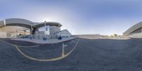 Panoramic view of a modern architecture building in Los Angeles. The building is surrounded by a parking lot and open spaces. The blue sky and sunshine create hard shadows. A perfect representation of city life in California.