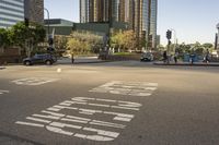 A stunning view of downtown Los Angeles at dawn. The modern architecture of office buildings reflects against the clear sky, casting hard shadows on the asphalt roads. The bustling city life and urban design come alive in this crosswalk-filled cityscape.